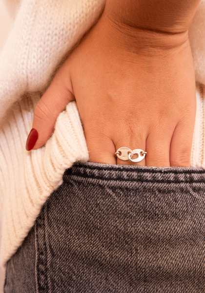 Inspirée par l’élégance discrète des formes pures, la bague Héra réinterprète le symbole du lien à travers un design graphique et délicat. Deux anneaux asymétriques, signature de la collection Héra, reliés par un fil rond.