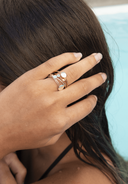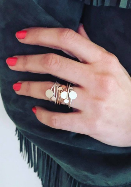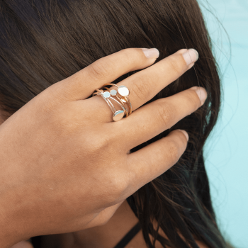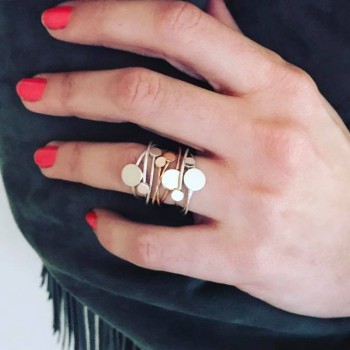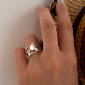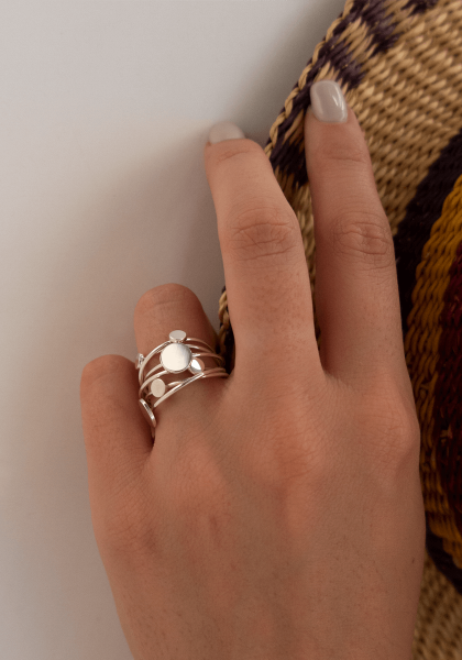 Notre Bague Lili est une création élégante et délicate, composée de trois fins anneaux entrelacés en argent massif. Chaque anneau est orné de petites médailles fixes, apportant une touche subtile de mouvement et de raffinement.