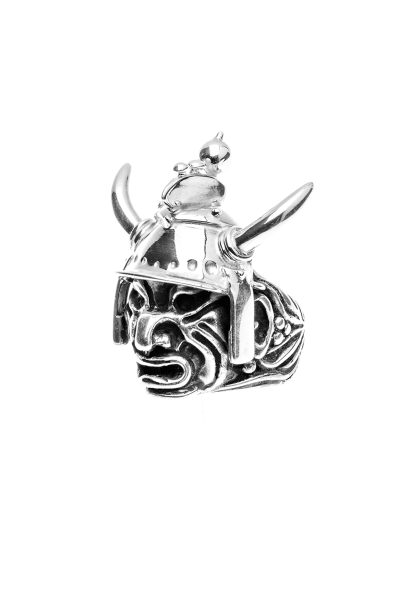 Cette chevalière imposante arbore une tête de samouraï sculptée avec minutie, coiffée d’un kabuto orné de cornes, symbole de puissance et d’autorité sur le champ de bataille.