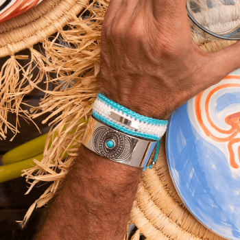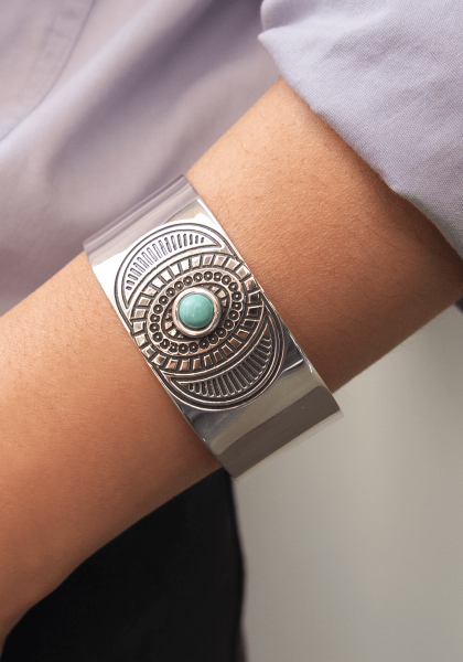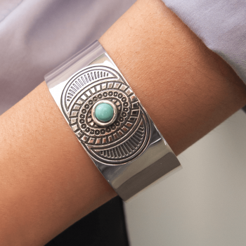 Changez complètement de décor avec notre Manchette Houston Petit Modèle avec Pierre. On y retrouve un motif unique aux inspirations amérindiennes, afro-américaines et hispaniques sur un jonc plat ouvert orné d'une pierre. Elle vient apporter une petite touche de couleur à la pièce.