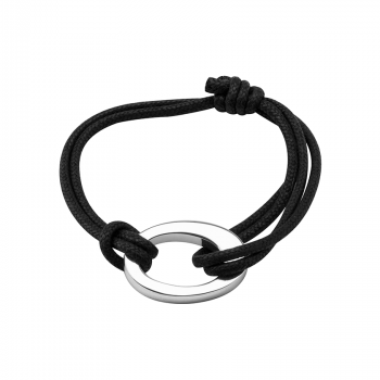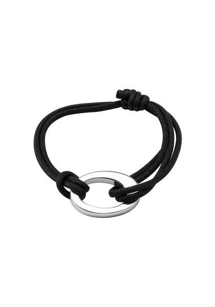Anneau ovale en argent monté sur un lien de coton réglable sur le poignet.