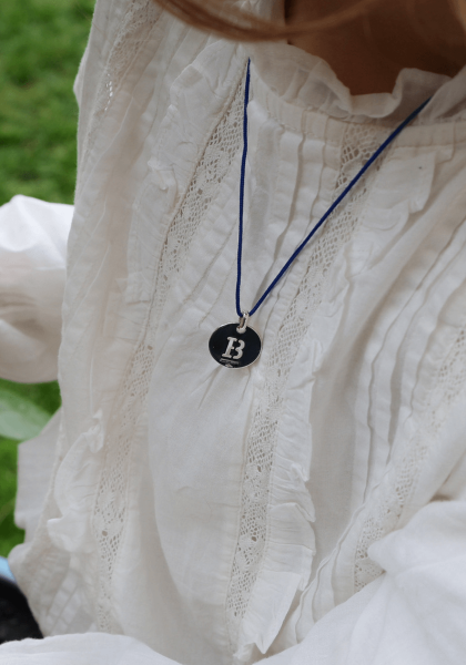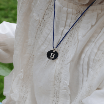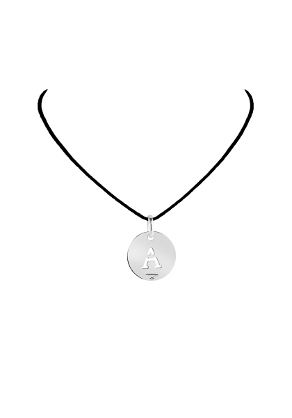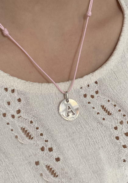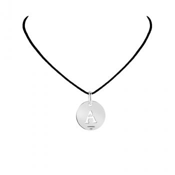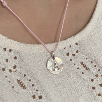 Pendentif en argent massif avec le lettre de votre choix évidé (diamètre de la médaille 1,8cm). Ce pendentif se porte sur un lien de coton enduit de la couleur de votre choix.