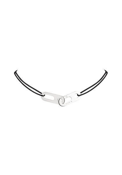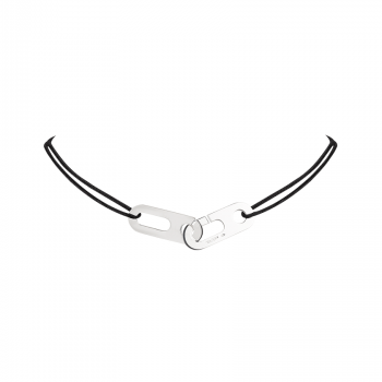 Cette paire d'anneaux emaillés en argent massif tel un fermoir monté sur un lien de coton, est présentée en pendentif mais peut être aussi porté en bracelet.