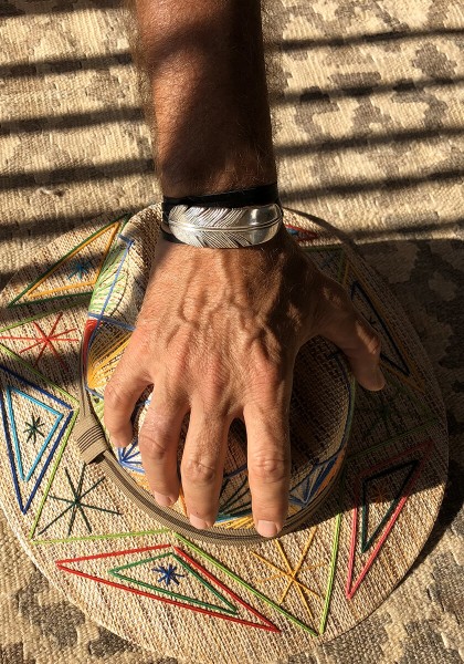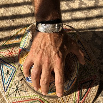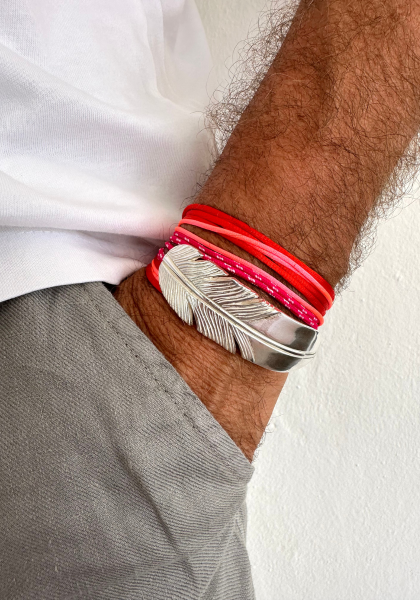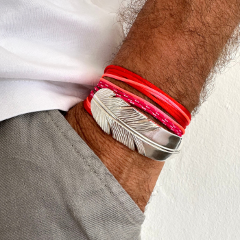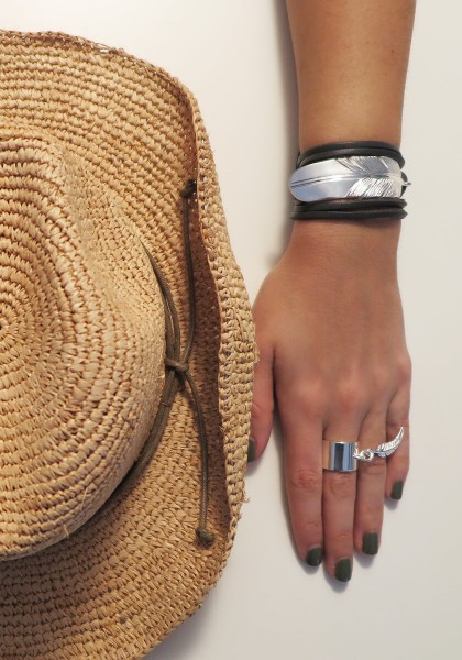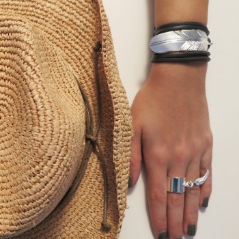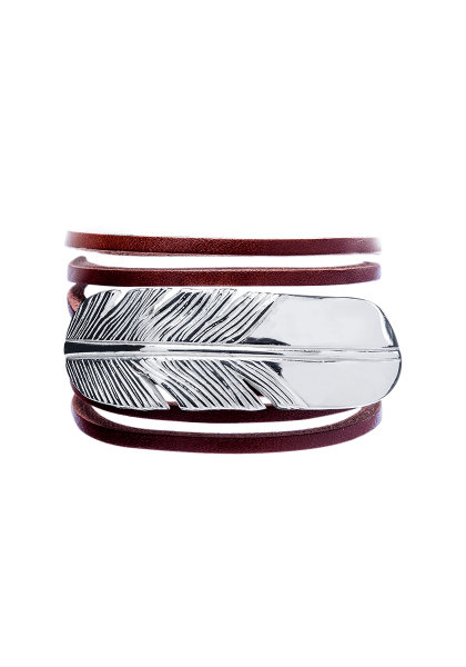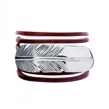 Sterling silver bracelet representing a feather on a leather strap. The length of the feather is approximately 90 mm.
