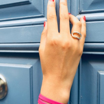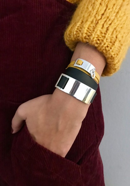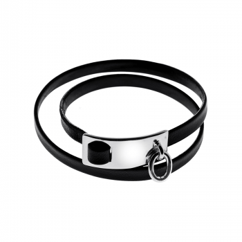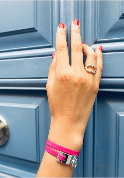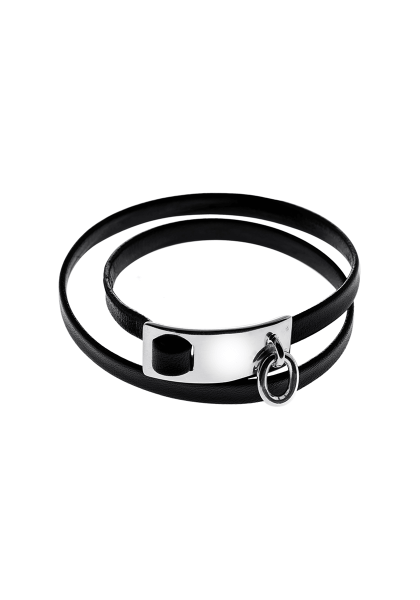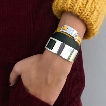 Embrace elegant simplicity with our Small Cuff Jungle Bracelet. It features a silver plate with a movable oval ring attached, mounted on a leather strap.