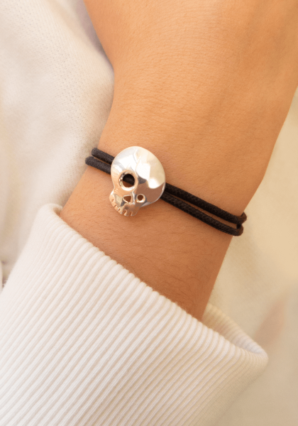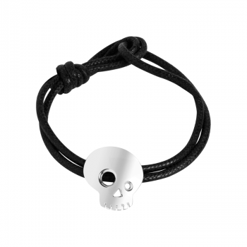 Skull Bracelet composed of a skull in sterling silver on a red nylon link.