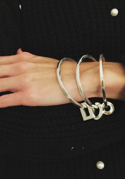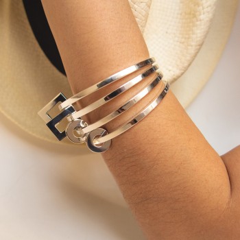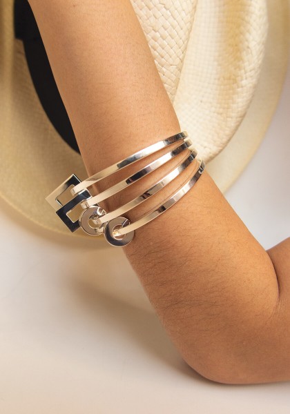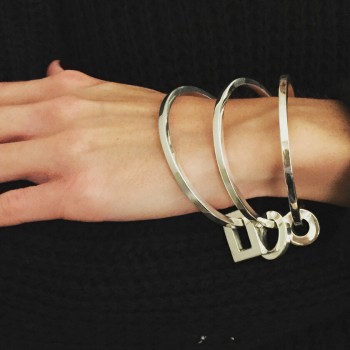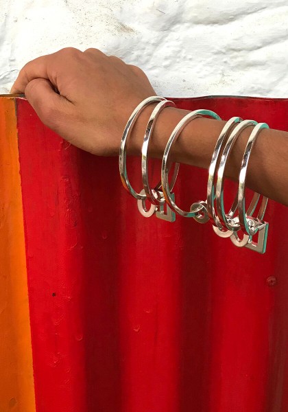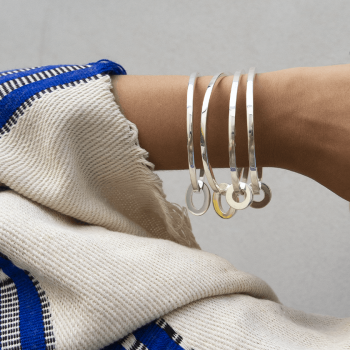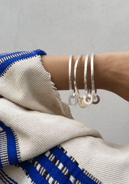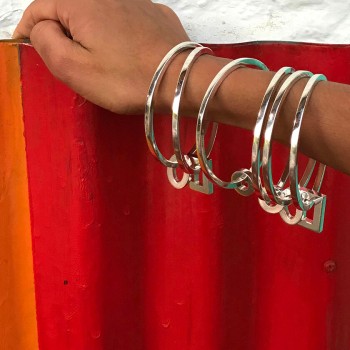 Our Romina Bangle Bracelet is an elegant and modern piece of jewellery with its square round wire. It is adorned with a round ring that also has square edges. This timeless piece goes perfectly with the Rebecca and Ophelia bangles, forming a graphic and elegant trio when worn together.