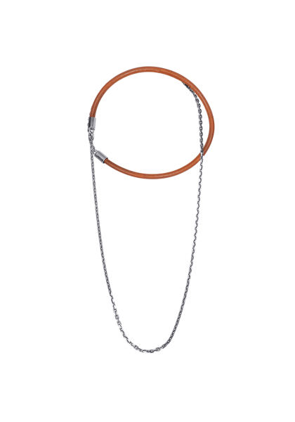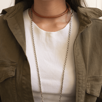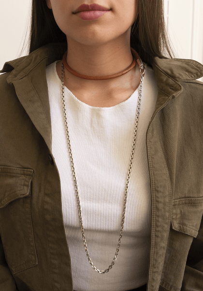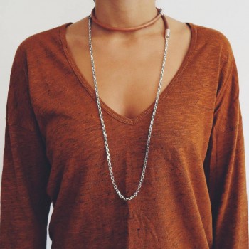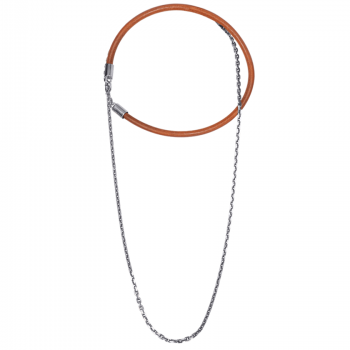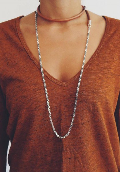 Our Melissa Necklace combines delicacy and modernity. Made from silver and leather, it features a fine chain embellished with a round cowhide leather lace, elegantly highlighting the neck.